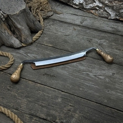 Coltellino ricurvo grande. Lama affilata. Forgiato a mano in acciaio al carbonio temprato, manico ergonomico in frassino, con guaina in pelle.